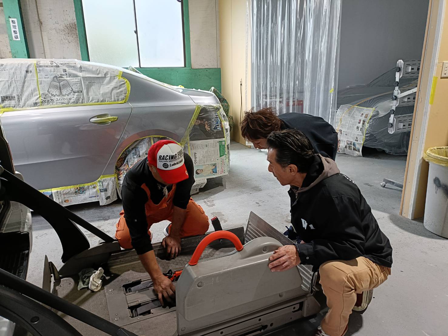 今回は雨天に備えて、夫が経営する板金塗装工場をお借りして実施。